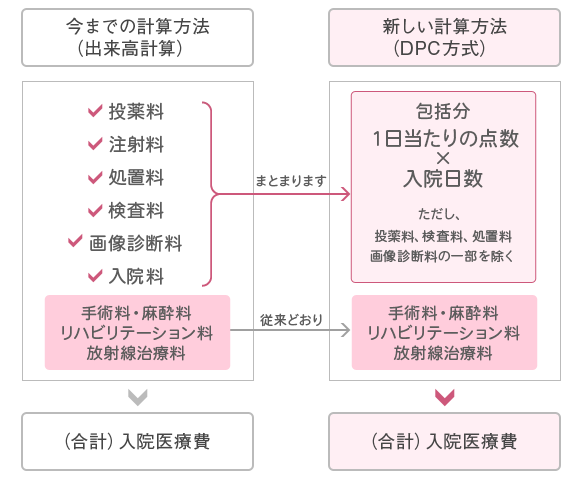 患者さんの傷病名及び診療内容・入院日数等により、1日当たりの医療費が決まるため、従来の
