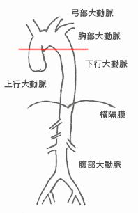 胸部と腹部との境界である横隔膜を境に、胸部側の大動脈を胸部大動脈、腹部側の大動脈を腹部大動脈と分類します。