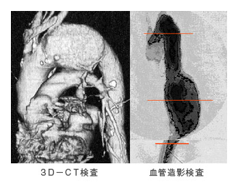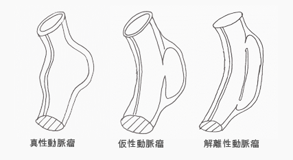 大動脈瘤には、血管がこぶ状に膨らんでおこる真性動脈瘤、血管の一部が欠如しておこる仮性動脈瘤、血管が裂けて発症する大動脈解離(解離性動脈瘤)があります。