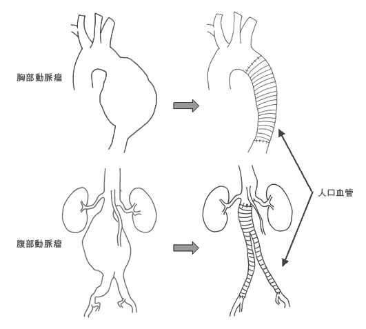 一般的には、心臓血管外科にて外科的に動脈瘤を切除して、人工血管に植え替える人工血管置換術を行います。
