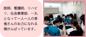 そして、患者さんの病態変化(身体的・精神的・社会的)を捉え、超急性期より早期退院へ向けて日々カンファレンスを行い、急性期からリハビリを実施し質の高いケアが提供できるように取り組んでいます。 |