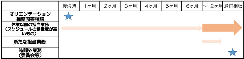 休業前に担当していた業務から開始する。スケジュールが組みやすいよう、時間が固定された業務よりも自身の裁量で調整できる業務や、勤務時間内に確実に終了することができる業務を優先的に担当する。臨床業務は余裕をもって少ない量から始め、余力のある時間は課の事務作業等を分担する。