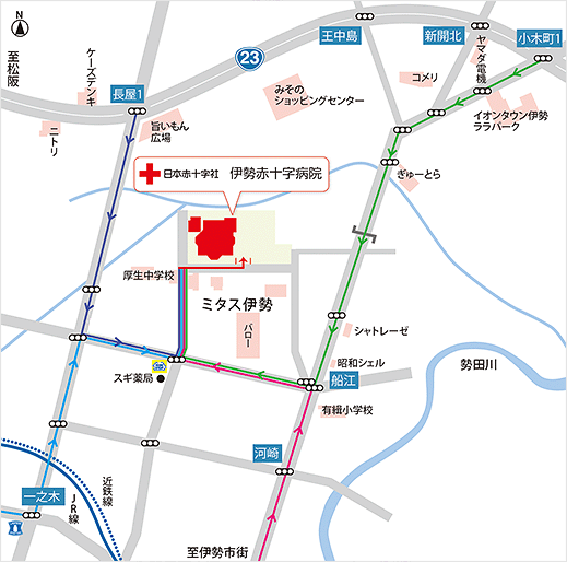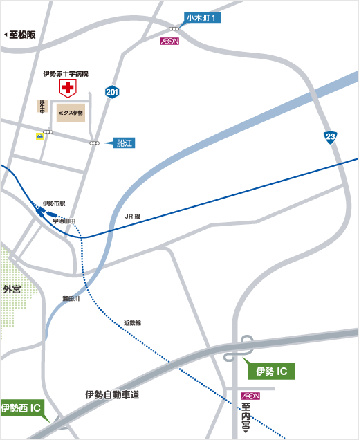・伊勢自動車道 伊勢インターチェンジを津・松阪方面出口より国道23号線(南勢バイパス)に入る。