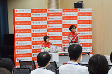 医療チーム第3班への派遣が決定した東看護師長を応援すべく、2017年11月21日(火)に激励会を開催しました。会には、看護師をはじめ多くの職員が集まりました。楠田院長、谷副院長兼看護部長から激励の言葉が贈られ、看護部からは花束と伊勢神宮のお守りが手渡されました。今回で3度目の派遣となる東看護師長からは、支援する病院職員への感謝の言葉と救援活動への抱負が述べられました。