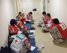 0:00より深夜業務開始。業務内容は院内救急患者の対応であった。今回は長野市民病院救護班チームと合同で行った。体調不良、喘息、不眠、大腸潰瘍など十数名の患者さんを診察した。深夜患者数が少なくなったため両チームとも交互に1時間半程度仮眠した。早朝から患者が多くなり、8:00から次チームに業務の引き継ぎを行い、8:30に業務終了とした。院内は空調により快適だが、早朝の院外は冷え込みが強く被災者の健康状態を心配した。朝食後9:30に仮眠、11:に起床し、長野市民病院と共に石巻赤十字病院にある救援物資を車内いっぱいに積み込み、12:30門脇中学校へ診療に向かった。門脇中学校では1000人ほどの被災者が避難されていた。門脇中学校では山田日赤は教室を回る巡回診療、長野市民病院は救護所にて診療を行った。我々は教室を回りながら救護所にて診療を行っていることをアナウンスし、歩行できない傷病者に対して診察を行った。患者数は十数名であった。こころのケアが必要な被災者も数名いた。