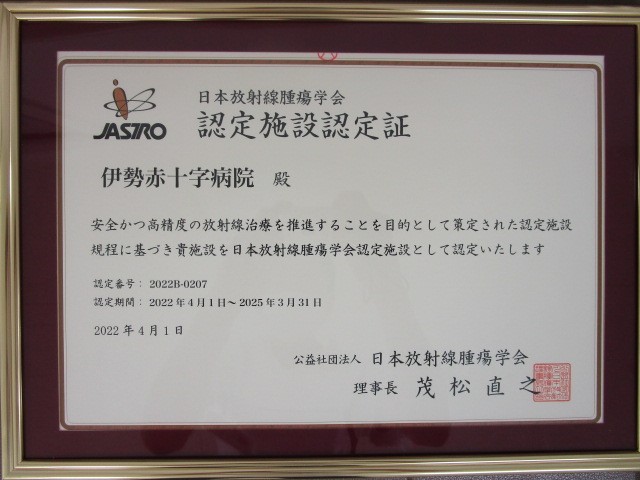 当院は日本放射線腫瘍学会から「日本放射線腫瘍学会認定施設」として認定されています。