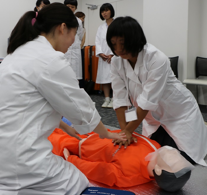 生徒たちは白衣更衣後、グループに分かれ、AEDを使用した心肺蘇生、シミュレーターを用いた