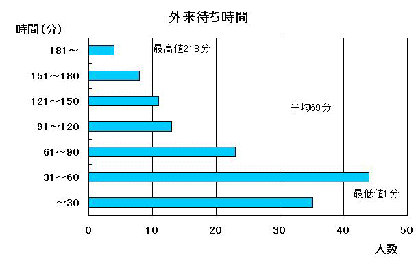 | 平成18年10月、外来初診患者さんを対象にアンケート調査を実施しました。 お忙しい中、ご協力してくださりありがとうございます。 毎年、「外来待ち時間調査」を実施致しておりますが、本年度を総合的に見ますと、昨年度と同様外来待ち時間の平均時間は、約1時間で計算時間・調剤時間は昨年と比して短縮されていますが、まだまだ診察を終えられ帰っていただくまでの時間が長いようです。 この事に関しては今後も検討、改善して少しでも患者さんの待ち時間が短くなりますように努力していく所存でございます。 又、「お気づきの点」として、駐車場が少ない、詳しく説明アドバイスしていただきたかった、待ち時間が長いので疲れた、優しく対応していただきたい、エレベーターホールの床に何階かを書いて欲しい等、皆様から大変貴重なご意見ご要望をいただきました。 又、当院職員の業務・対応に対する感謝のお言葉もいただきました。 このような皆様の声を私たちの宝物として受けとめて、できる事から一つ一つ真剣に改善してまいりますので、これからもお気づきの点はご遠慮なくお知らせ下さい。ありがとうございました。 |
