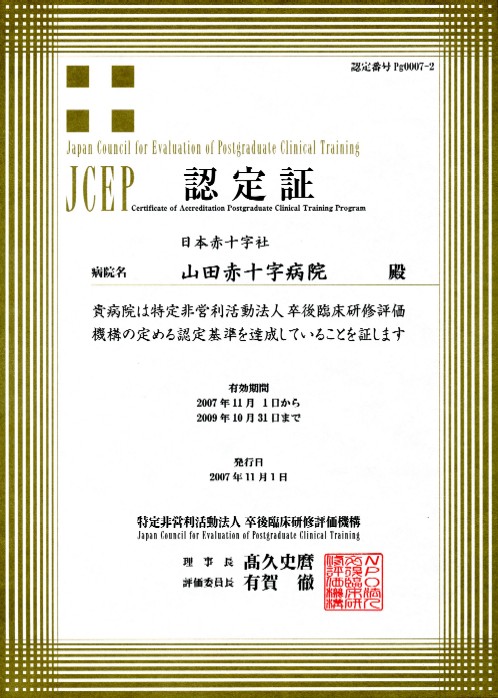 当院は、特定非営利活動法人 卒後臨床研修評価機構より平成19年11月1日付けで臨床研修評価の認定を受けました。
