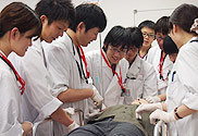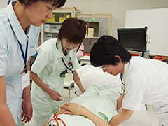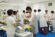 新研修医を対象に、ハートシム4000、気道管理人形、エアーシム、レサシアン、AEDトレーナー等を使用し、ICLSコースを実施しました。指導は、院外から招聘した医師2名のほか、救命救急センター長、後期研修医、救命救急センター・ICU/CCU/HCU・手術室勤務の看護師らが担当しました。最初は不安な表情で行っていた気管内挿管や除細動も、繰り返し練習することにより、的確な指示を出しながら自信をもってできるようになりました。