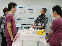 当院では、新生児蘇生法「専門」Aコースを3回/年、新生児蘇生法「一次」Bコースを3回/年、行っています。当院の初期研修医、院内外の周産期医療に携わるスタッフが受講しています。指導は小児科部長が中心となり、指導者育成も視野に入れたコースの運営を進めています。