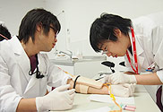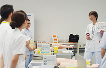 新研修医を対象に採血静脈注射シミュレーターを使用し、静脈留置針(サーフロー)挿入のトレーニングをしました。指導は、救命救急センター長、集中ケア認定看護師2名、DMAT登録の看護師長2名が行いました。