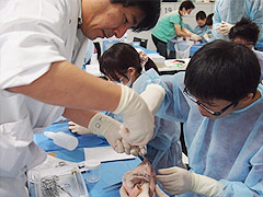 新研修医を対象に、心臓の解剖を理解し外科的基本手技を学ぶことを目的に、ブタ心臓を用いたWet Labを開催しました。院外から招聘した医師3名のほか、当院の胸部外科医師全員の指導により、知識・手技の確認がきめ細やかに行われていました。