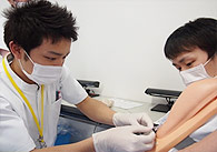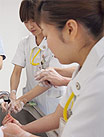 新人看護職員を対象に感染管理技術と身体侵襲のある看護技術について、手洗い評価キット、採血静脈注射シミュレーター、臀部筋肉注射シミュレーター、上腕筋肉注射シミュレーターを用いた技術研修を行いました。最初はぎこちなかった注射器を持つ手も繰り返し練習することによってだんだんとしっかりしてきました。指導は、感染管理認定看護師、部署の指導者(教育担当者)が行っています。